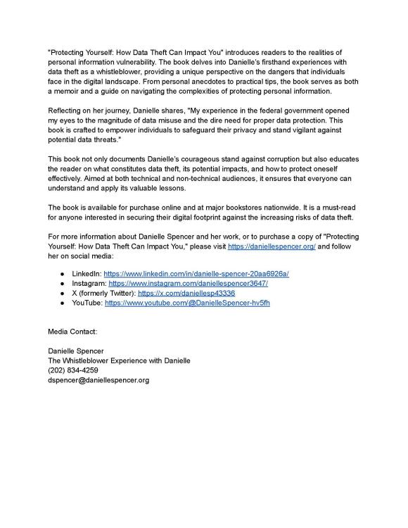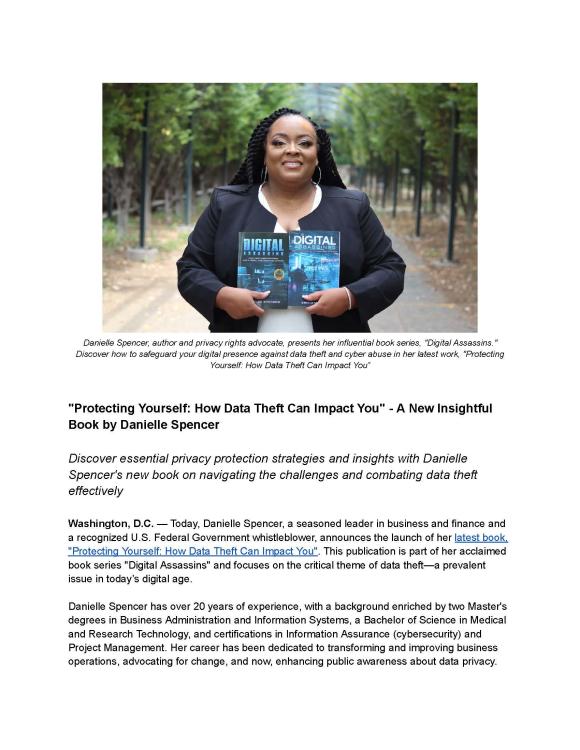 Today, Danielle Spencer, a seasoned leader in business and finance and a recognized U.S. Federal Government whistleblower, announces the launch of her latest book, "Protecting Yourself: How Data Theft Can Impact You" . This publication is part of her acclaimed book series "Digital Assassins" and focuses on the critical theme of data theft—a prevalent issue in today’s digital age. Danielle Spencer has over 20 years of experience, with a background enriched by two Master's degrees in Business Administration and Information Systems, a Bachelor of Science in Medical and Research Technology, and certifications in Information Assurance (cybersecurity) and Project Management. Her career has been dedicated to transforming and improving business operations, advocating for change, and now, enhancing public awareness about data privacy.