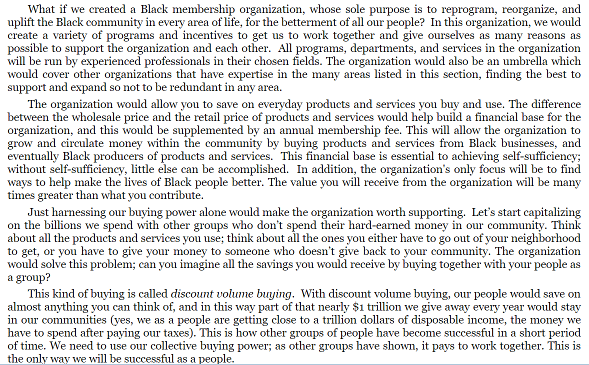 11. Hey @harry brown , I just read an excerpt from Black Unity: The Total Solution to Financial Independence and Happiness by Terrance Amen, which came out back in December of 2011. I just read the excerpt. The idea is that Black folks would form an organization in which we would pool our resources, provide our own education, use our own services and keep the money within our own community. Our spending power is more than many nations and if we simply choose to wield it in an organized fashion we would all be much better off. Of course, this sounds great in theory but would be virtually impossible in practice. Harry I'm not sure if you've noticed but the handful of folks who post here regularly can have profound disagreements on a wide variety of topics. We've willing to talk about and understand the nature of our differences (at least I think we are) but most people are not nearly so open. We also have the another problem; the hope for the American Dream, which often means a nice corporate gig, a home in a nice white neighborhood replete with white-run schools and business, and for some a nice white spouse. This lifestyle choice is perfectly rational, in an American context. White neighborhoods are provided with better services and the families in them enjoy better outcomes; less crime, better schools, higher property values, nicer stores, better parks, etc, etc. It would be entirely unrealistic to expect large nubers of families to give up a relatively comfortable life to struggle with the masses. People tend to do what they feel is in their best interest. The tremendous buying power of Black folks largely belongs to people who are fairly secure, and not likely to direct resources and support. People will support their local Church, maybe a Greek letter organization, or some other social club, but supporting some unformed organization with the grandiose goal of unifying all Black people globally--forget about it... I, for example, could not have run AALBC.com full time before reaching middle age. I needed money, I wanted to travel, raise a family and have a comfortable life. I could not have done that with the money I earn from AALBC.com. A significant part of the reason is a lack of support from Black folk. I have trouble getting folks to pay full retail price for a book when buying it directly from AALBC.com--instead, they choose to support the white-owned Amazon. Again I understand the reasoning. Why pay full price from me, when Amazon will sell them the book for 40% off and get it to you the next day (same day in NYC) with free shipping? That is a rational decision, right? Maybe. I say maybe because AALBC provides services that Amazon does not. As more people support Amazon rather than an AALBC.com, AALBC.com growth is constrained. The upgrade which will take two years could have been done 5 years ago in less that 3 months with more resources. This is exactly why we have fewer book sites today than we had 10 years ago and all the ones still active struggle. I envied some of those sites that no longer exist because they were doing great things, but readers will never enjoy those sites because they are gone now and were never able to realize their full potential. Now I can explain to people that Amazon is supported by Wall Street investors who gives them money to grow. This allows Amazon to sell books at a loss, kill competition, and dominate a market. This is uninteresting-they just want cheap books. Meanwhile, I have to actually cover my expenses--no one is just giving me money to AALBC.com grow (well a few people are but not nearly enough). That is just one example. Now extend this across the entire landscape of products and services, and you begin to see how challenging a proposition it would be to get a critical mass of Black folks to support Black business.