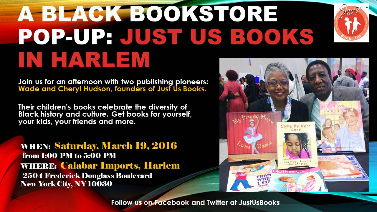 Join us for an afternoon of Black Books with two Black book pioneers, Wade and Cheryl Hudson of Just Us Books. Get books for you, your kids, family and friends. Just Us Books will be popping up in our store for one afternoon. WHEN: Saturday, March 19, 2016 from 1:00 PM to 5:00 PM (EDT) WHERE: Calabar Imports, Harlem - 2504 Frederick Douglass Boulevard Calabar Imports, New York, NY 10030 RSVP (free)