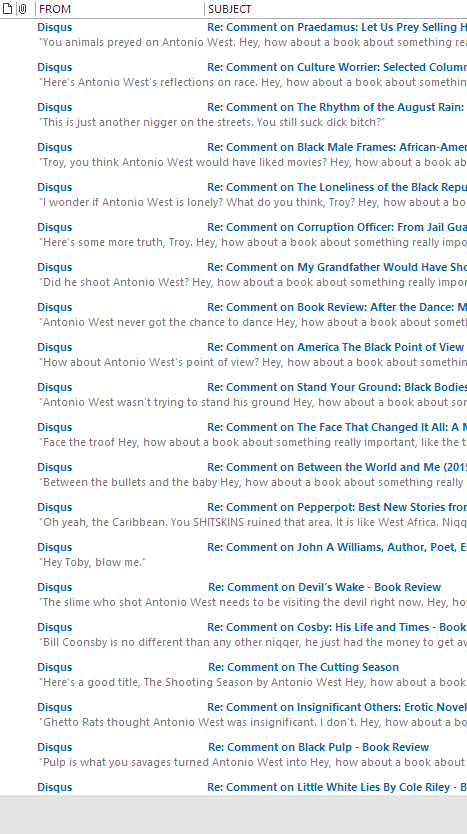 6. You know you've reached a certain level of prominence when racists relentlessly attack you. I had to delete scores of comments on 4 different websites. In some perverse way I feel bad for these folks who vent the racist hatred. Some white folks are angry but they have no clue who the enemy is. Black people were never under any illusions--sure we gun each other down in the streets from time to time, but at the end of the day most of appreciate who the oppressor is. It is not the good 'old boy on the other side of the tracks --any more than it is a rival gang member of the other side of town. Image being a white man in America seeing jobs sold overseas, seeing homes foreclosed, and truly believing the people doing this give a crap about you... it must be classical cognitive dissonance trying to wrap your brain around the fact that these guys don't care about you any more than they care about us. I had to delete screens and screens of these messages (screens shot below). I would have left the individual messages stand if they were not spamming scores of pages. This anger needs to be more widely known. Trump's prominence is a reflection of this anger and the country ignores it at their peril. The Islamic state is the least of our concerns... .