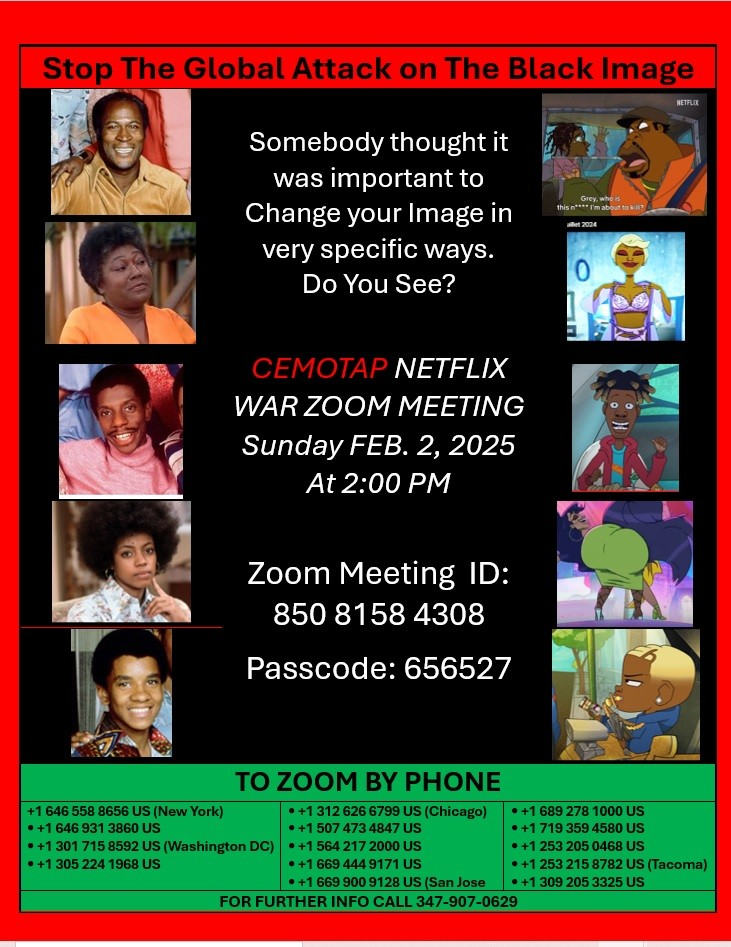Troy Posted January 31 Report Posted January 31 1. Sun Feb.2, 2025 at 2PM Agenda CEMOTAP NETFLIX WAR MEETING A. Actions Since last meeting B. Meeting Steph Curry in Chicago and L.A. and NY C. Recent CEMOTAP FCC Complaint D. Legal Response - Can the FCC Regulate Netflix. If So, how? If not Why Not LINK TO MEETING FEB 2, 2025 2PM https://us02web.zoom.us/j/85081584308?pwd=MVZVMU41Z3pTVlFMWmV6cGMrV2ZiUT09 Meeting ID: 850 8158 4308 Passcode: 656527 Dial by your location • +1 646 558 8656 US (New York) • +1 646 931 3860 US • +1 301 715 8592 US (Washington DC) • +1 305 224 1968 US • +1 309 205 3325 US